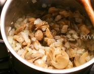 Hak de ui fijn en stoof op vet of olie. Voeg champignons toe, breng op smaak met peper en zout en stoof ze gaar. Voeg de gare champignons samen met geperste knoflook toe.